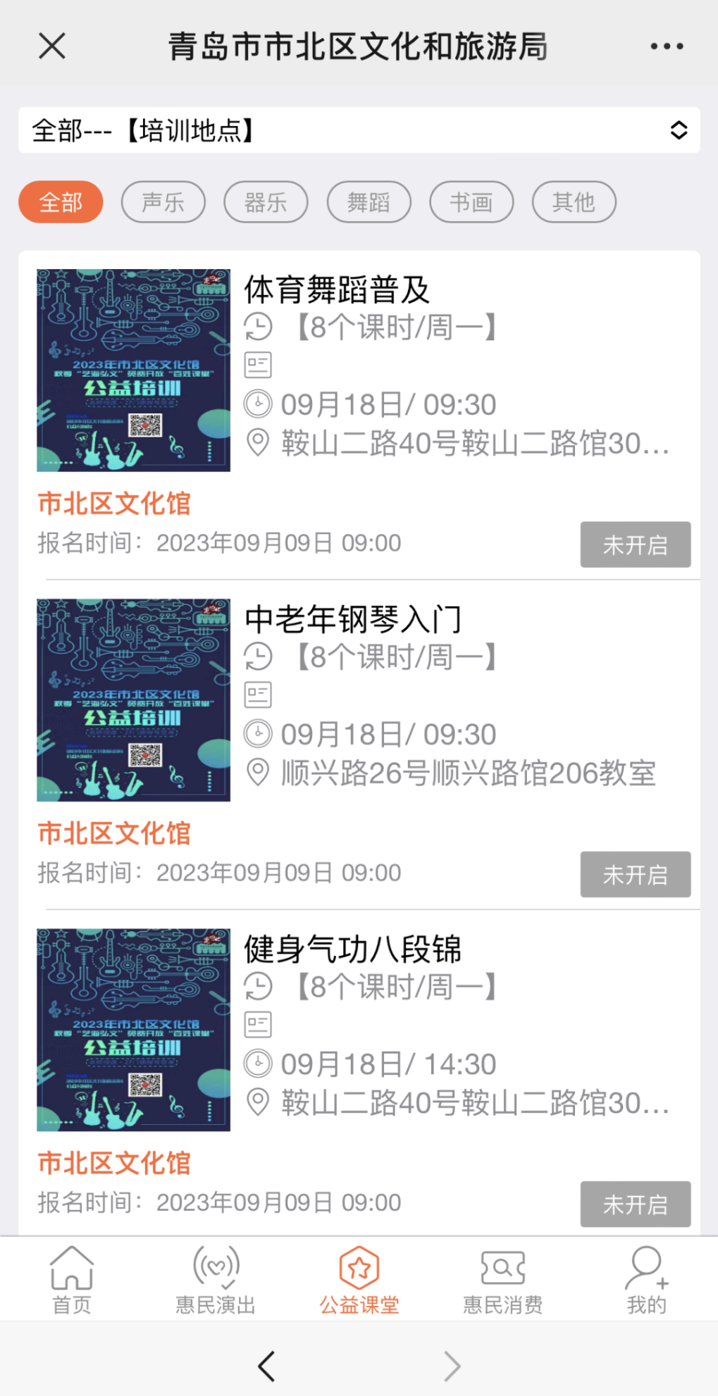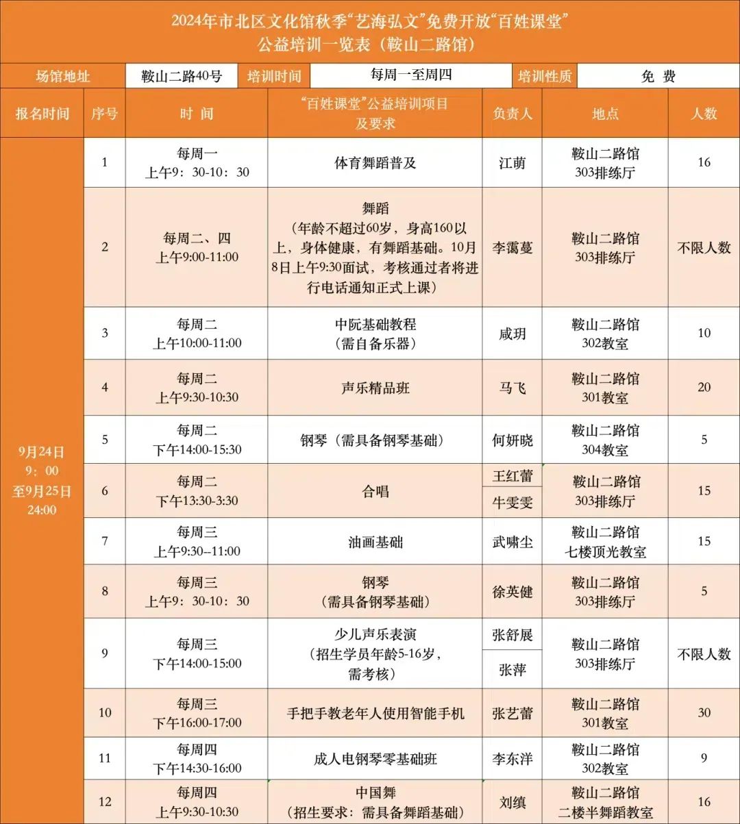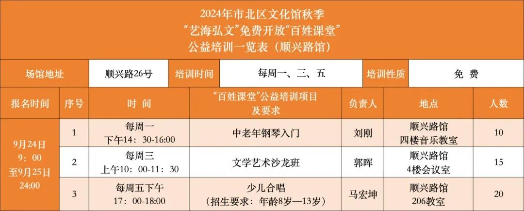 “艺海弘文”免费开放“百姓课堂”是市北区文化馆创办的艺术类普及公共文化服务品牌,2024年秋季培训即将开始,现将报名流程发布如下: